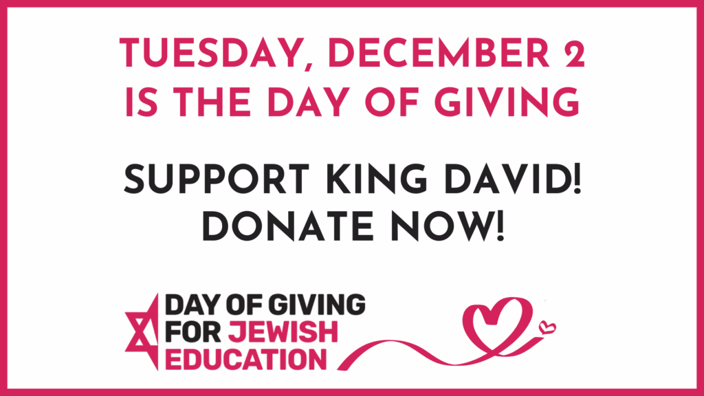 They will celebrate being Jewish through holidays, traditions, events and just going to school. Create a special bond with Israel through trips and programs. Be free to ask challenging questions about Jewish practice, Jewish values and current events. Students will leave King David with deep Jewish pride as well as the knowledge and determination to carry on Jewish traditions and build a Jewish life.